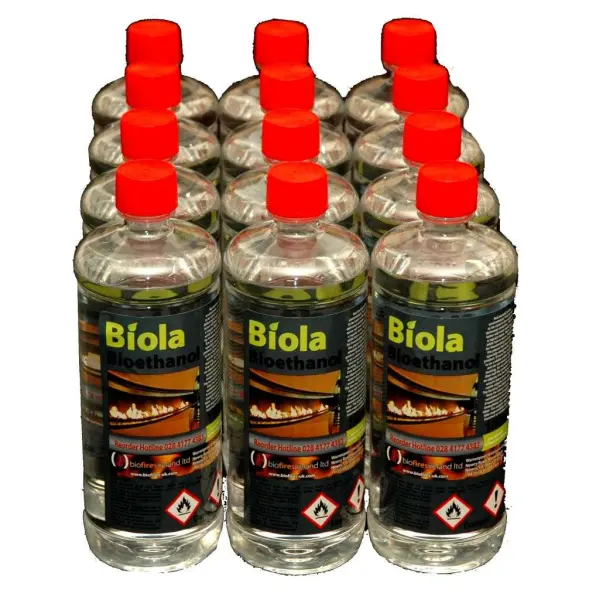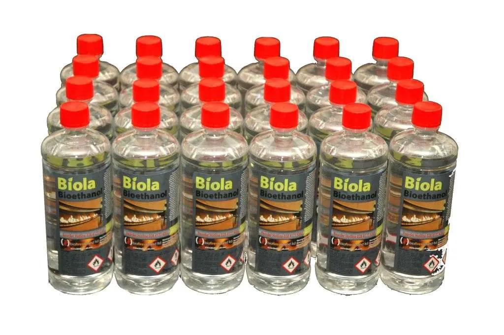 36 L Biola Premium Bioethanol Fuel – twenty-four sealed 1 L bottles of 96.5% pure, clean-burning ethanol. Perfect for indoor and outdoor fireplaces. Eco-conscious, safe, and easy to use.
