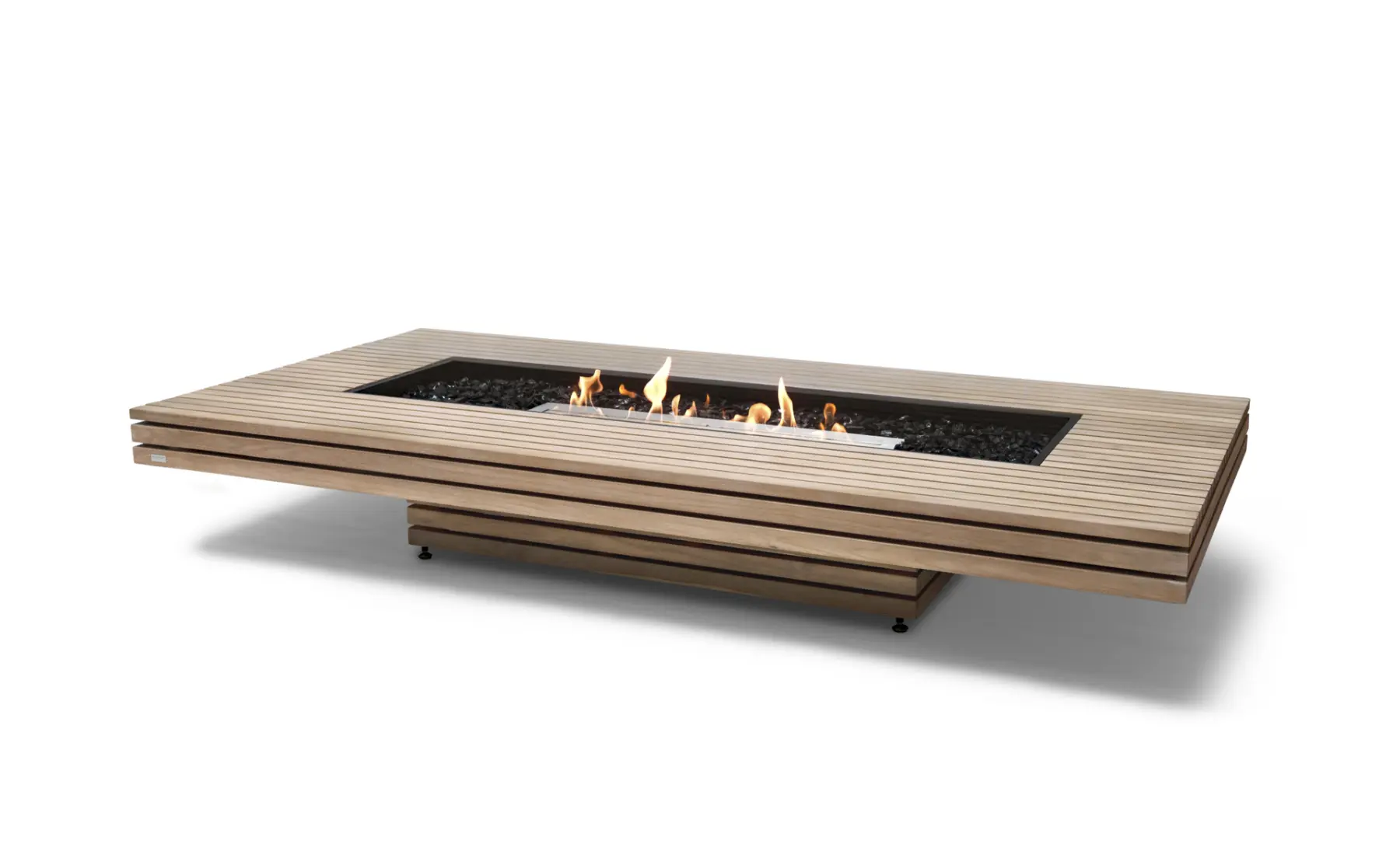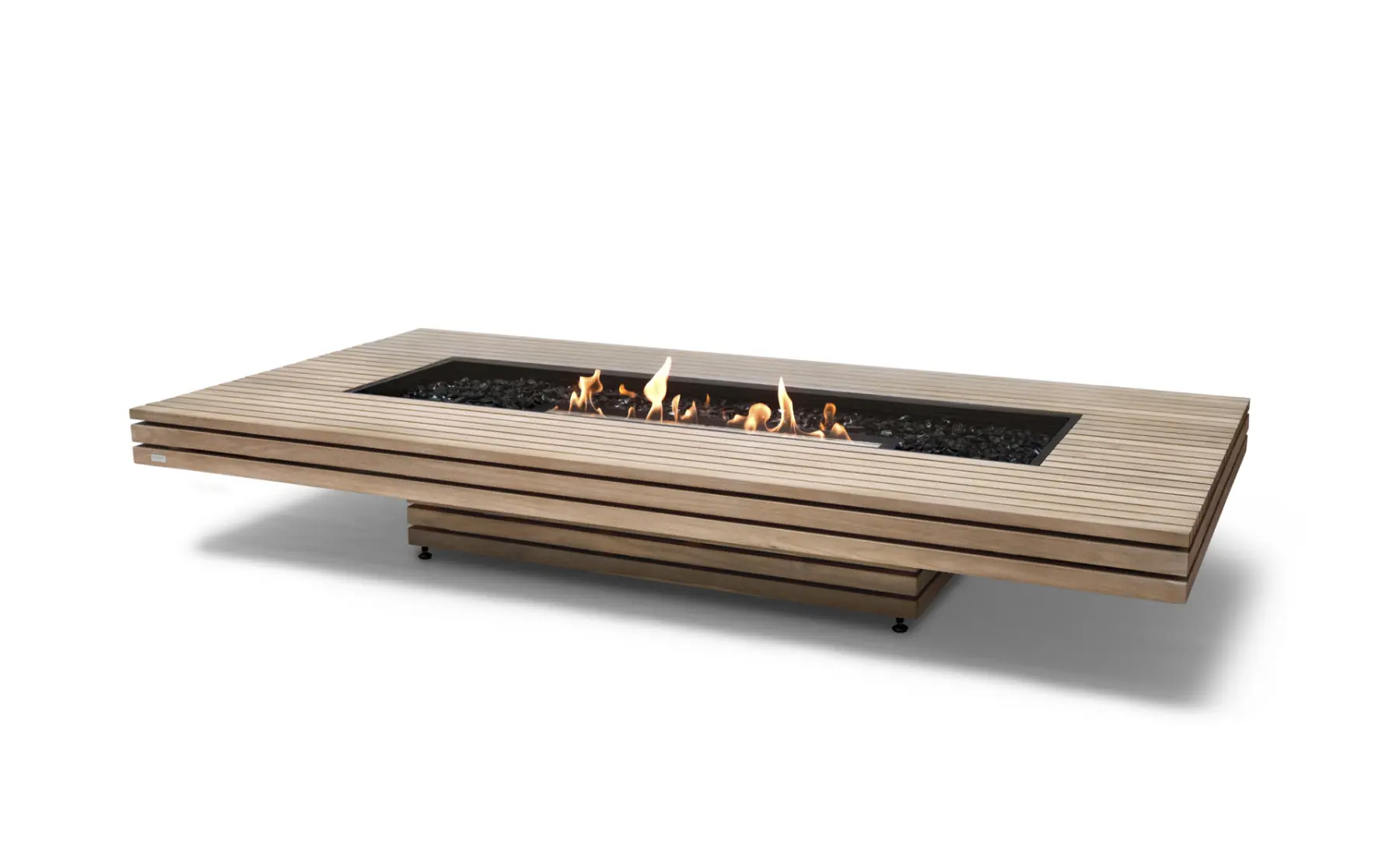Materials: Concrete composite or teak, stainless steel burner, toughened glass